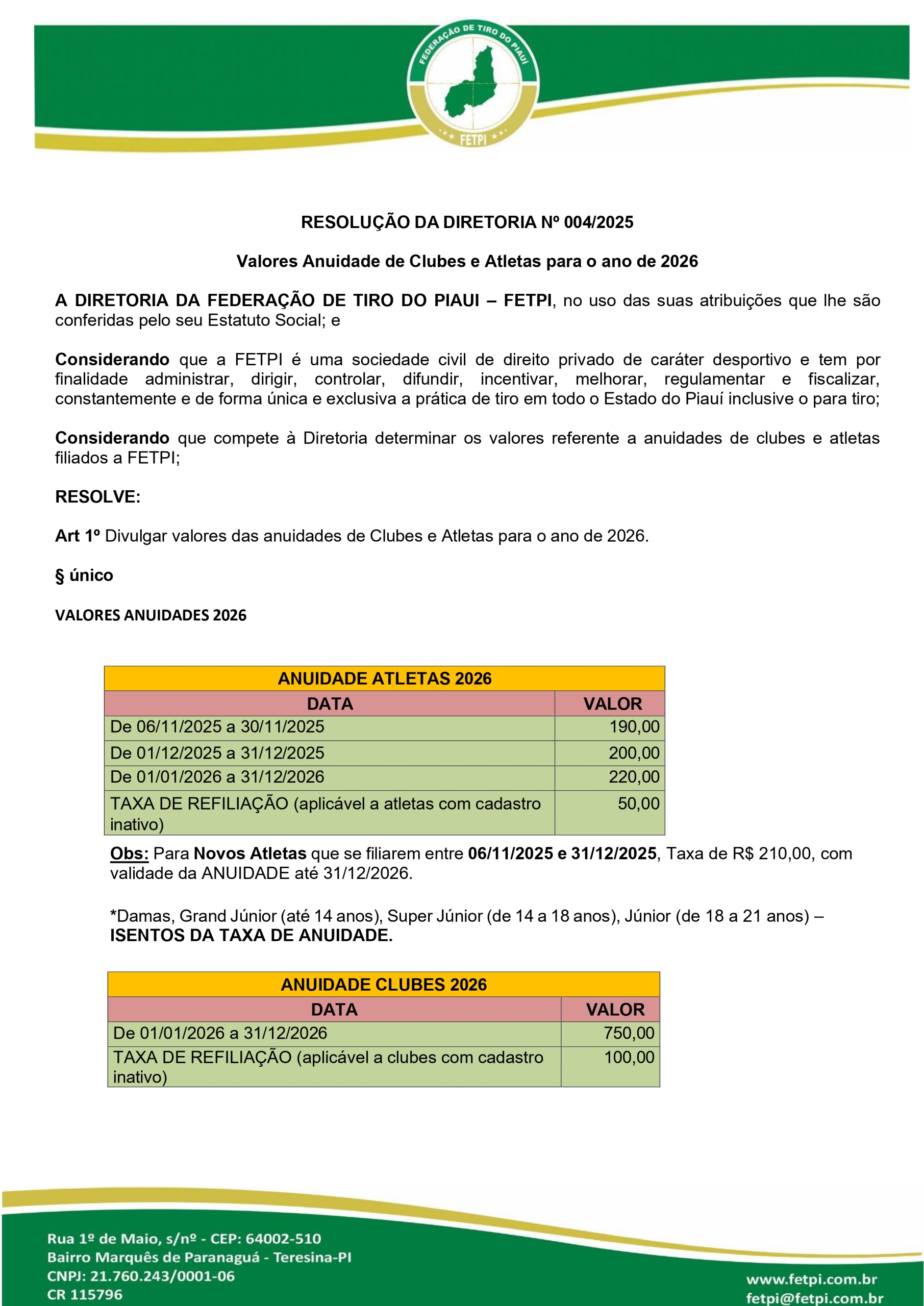 RESOLUÇÃO DA DIRETORIA Nº 004/2025 Valores Anuidade de Clubes e Atletas para o ano de 2026